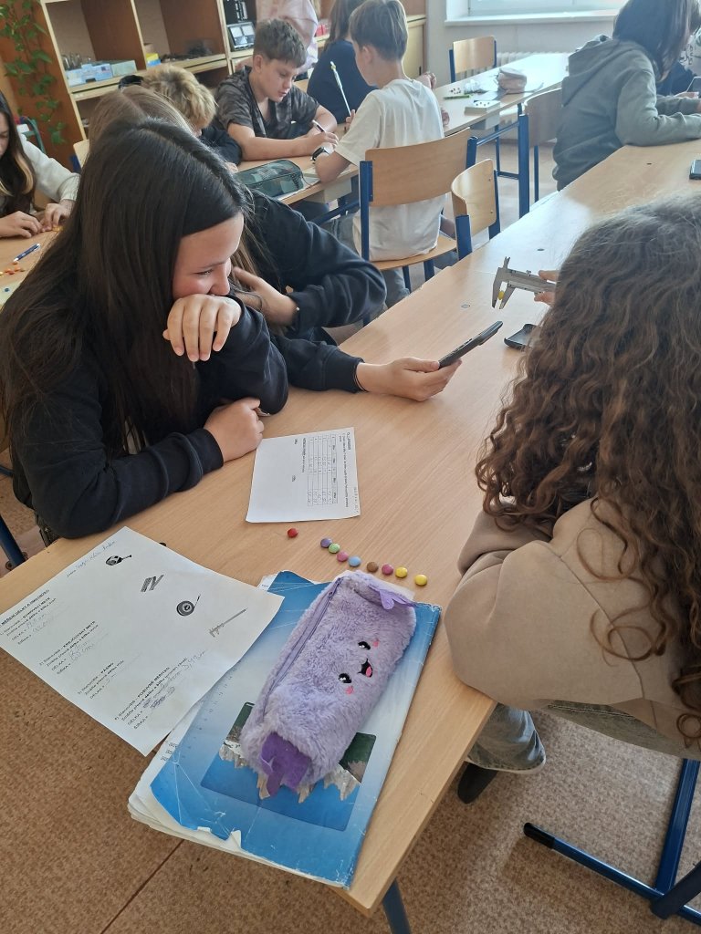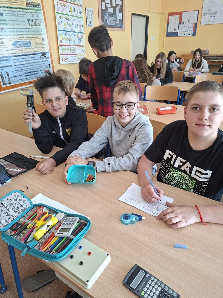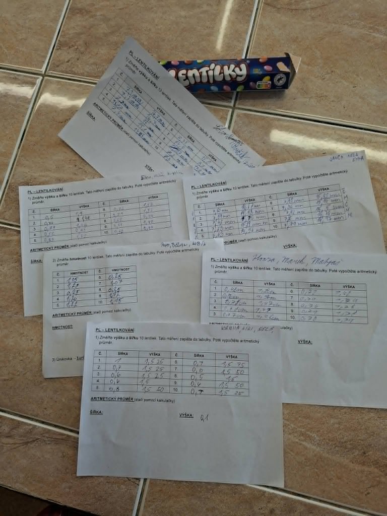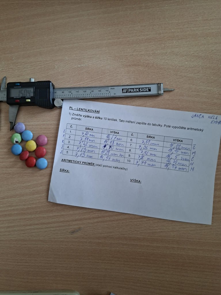 Datum: 29. 4. 2026Žáci 6. třídy se v hodině fyziky zabývali měřením rozměrů a hmotnosti lentilek pomocí posuvného měřítka. Pracovali ve skupinách a jejich úkolem bylo změřit výšku, šířku a hmotnost celkem deseti lentilek. Z naměřených hodnot následně vypočítali aritmetický průměr, aby získali průměrné hodnoty jednotlivých veličin. Aktivita žákům pomohla lépe pochopit princip měření s posuvným měřítkem.