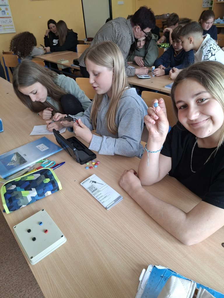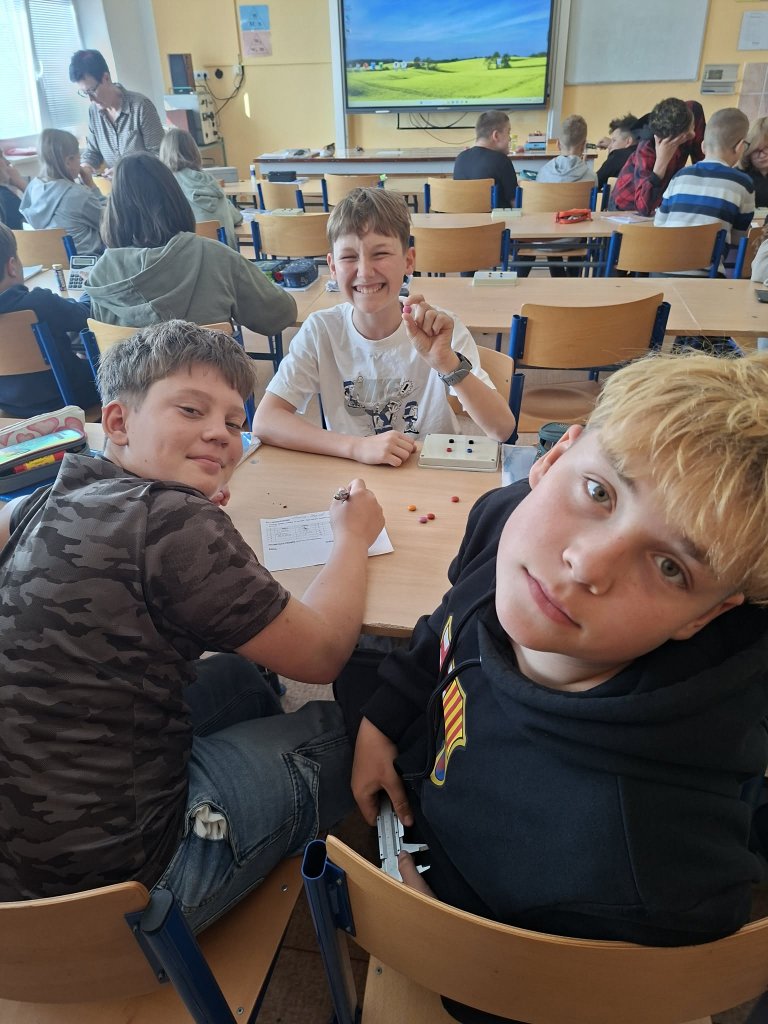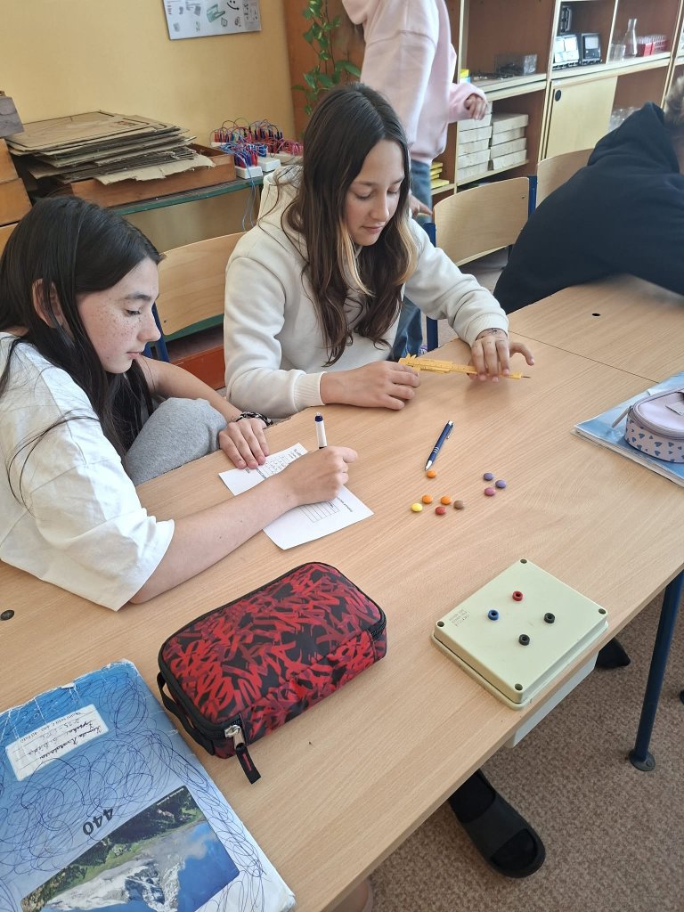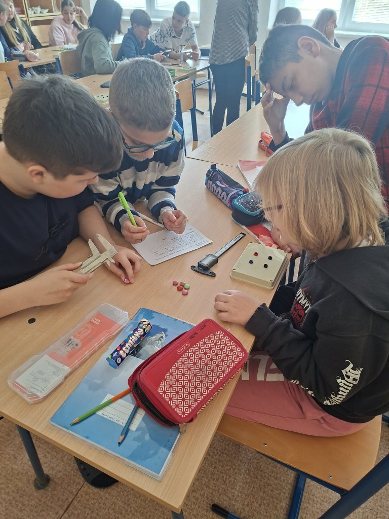 Datum: 29. 4. 2026Žáci 6. třídy se v hodině fyziky zabývali měřením rozměrů a hmotnosti lentilek pomocí posuvného měřítka. Pracovali ve skupinách a jejich úkolem bylo změřit výšku, šířku a hmotnost celkem deseti lentilek. Z naměřených hodnot následně vypočítali aritmetický průměr, aby získali průměrné hodnoty jednotlivých veličin. Aktivita žákům pomohla lépe pochopit princip měření s posuvným měřítkem.